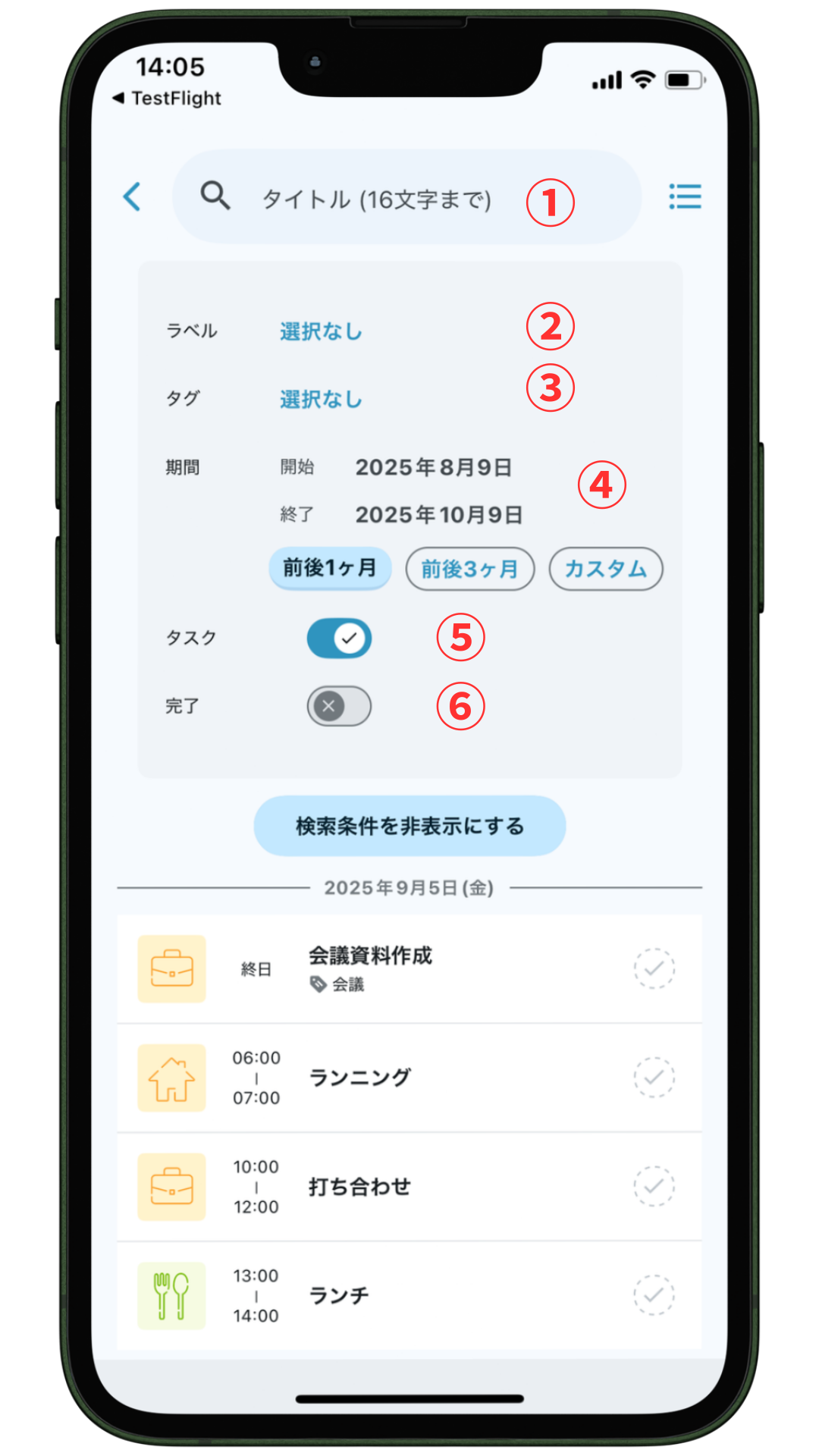 条件に合ったToDoまたはメモが一覧で表示されます。