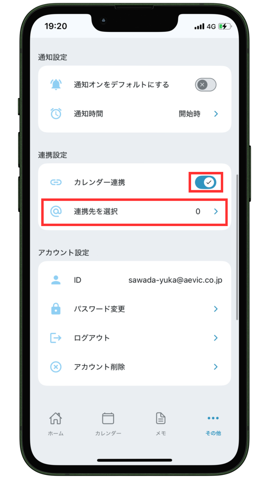 ①メニュー画面から「設定」画面に移動し、カレンダー連携ボタンを”ON”にします。