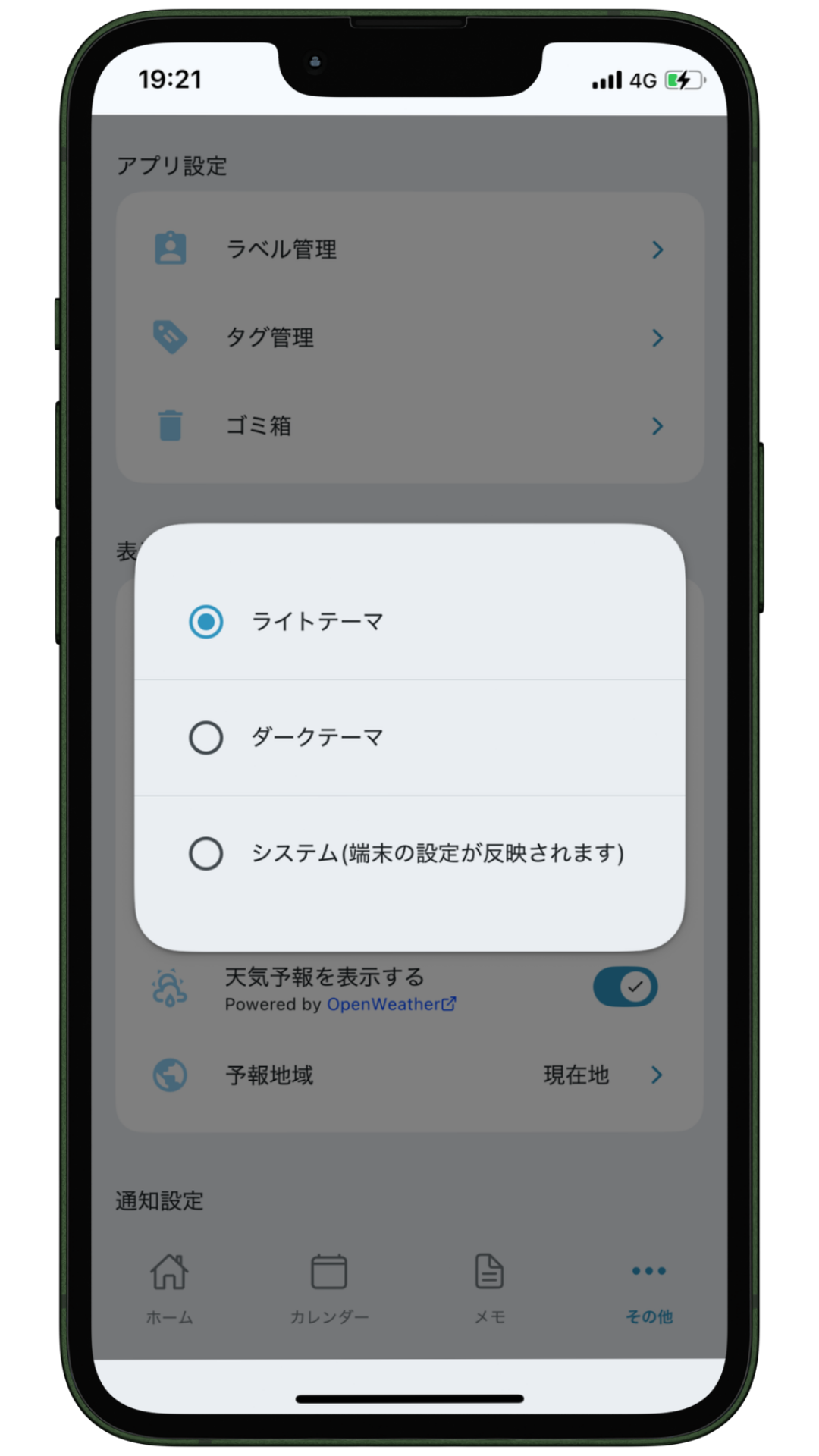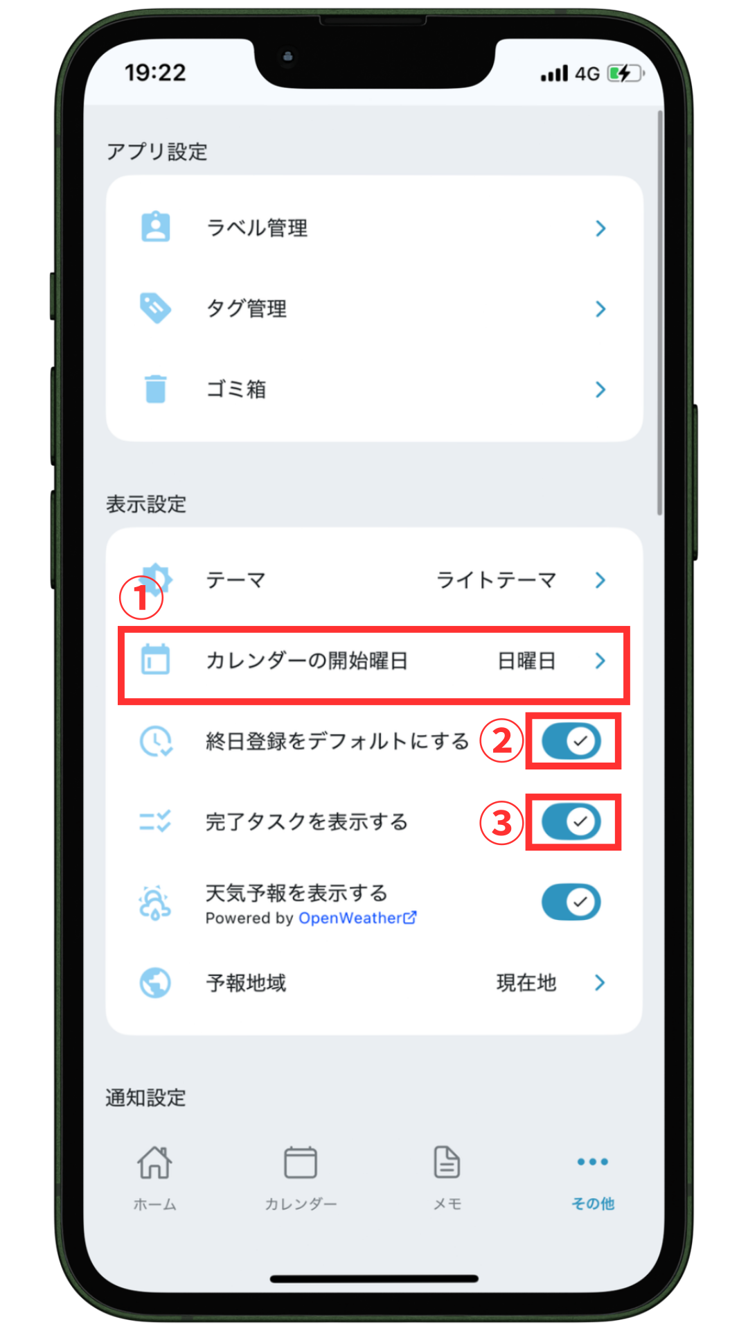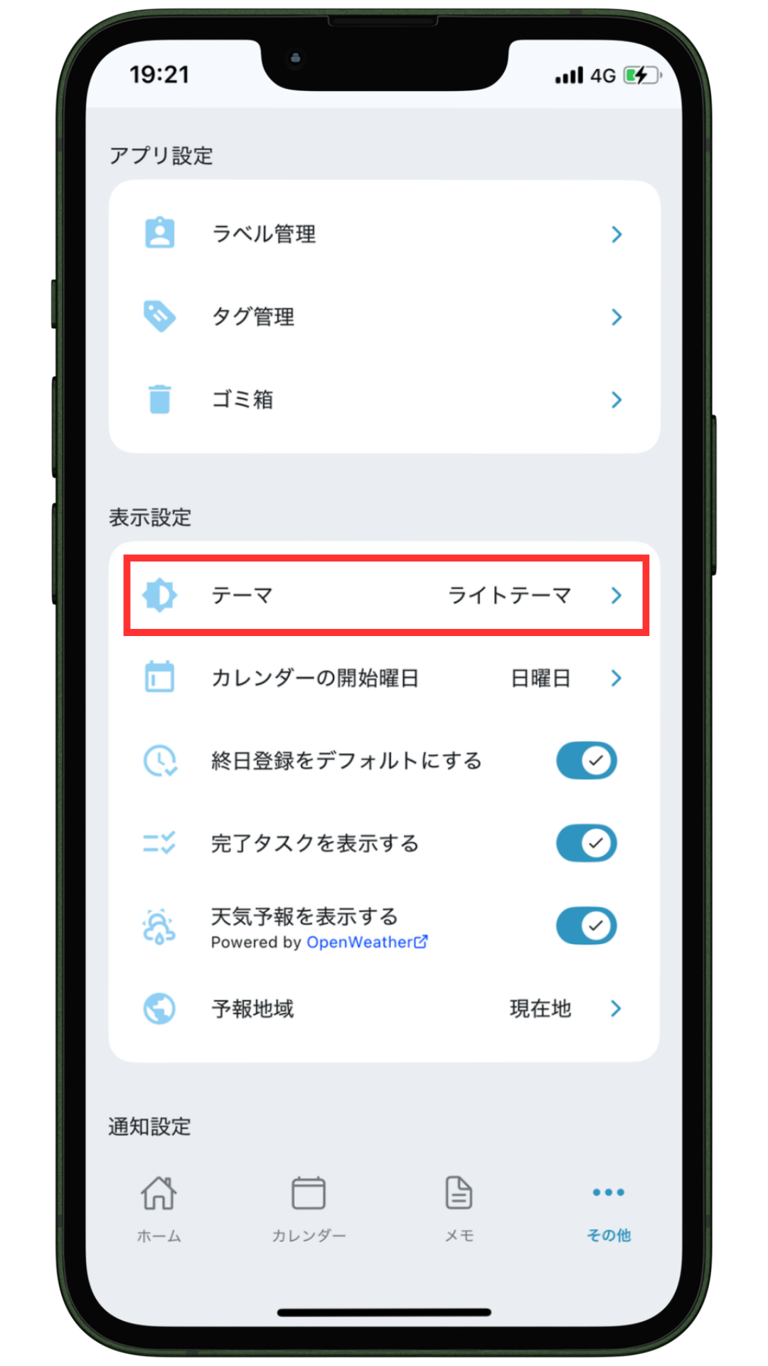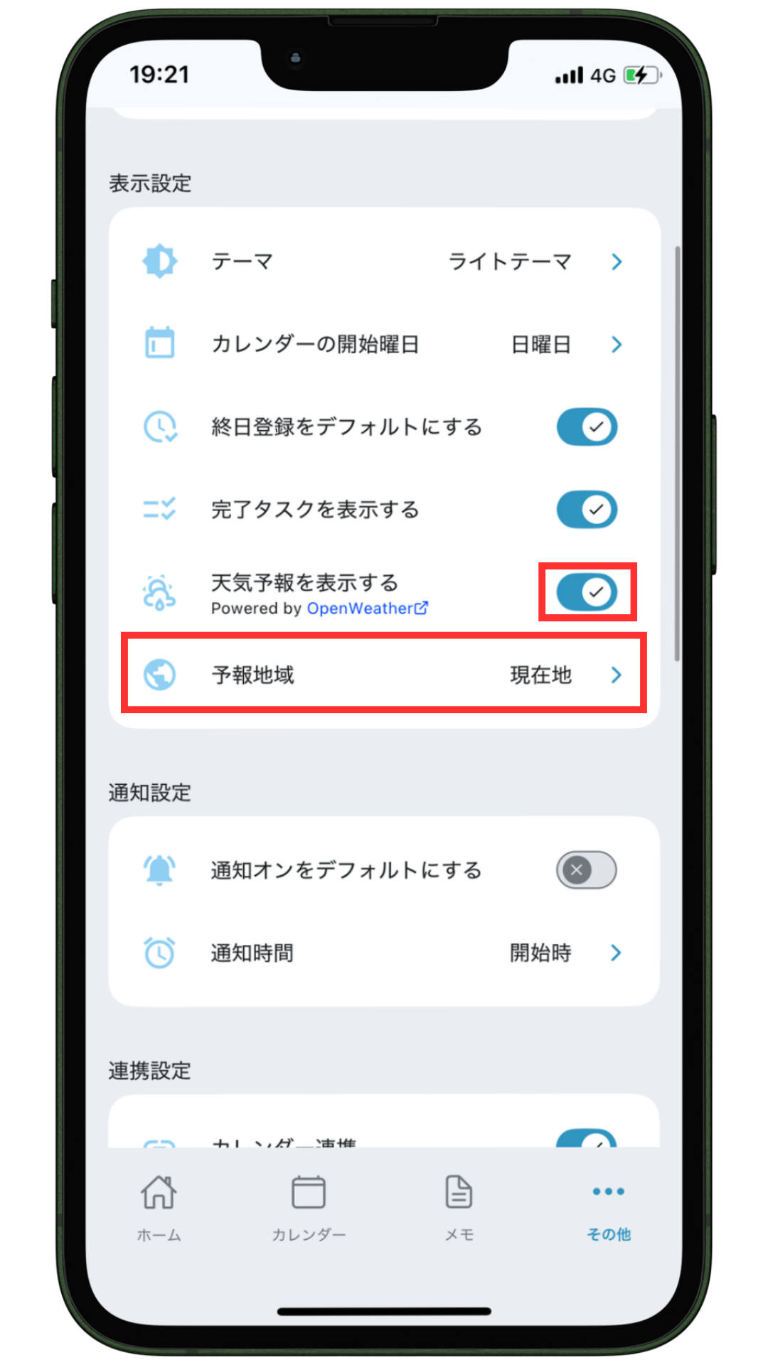 ボタンを”ON”にすると、ホーム画面の日付横に天気予報が表示されます。また、1週間後までの天気予報がカレンダーに表示されます。