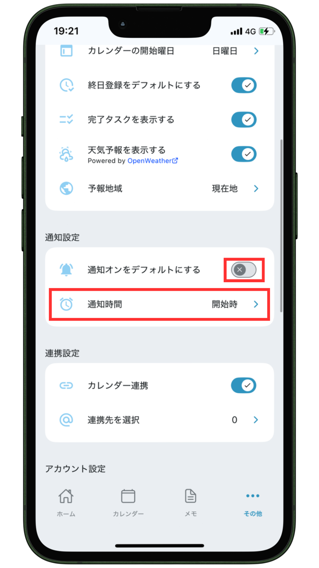 デフォルトの通知の有無と通知時間を設定することができます。通知の有無は、登録タスクごとに変更可能です。
