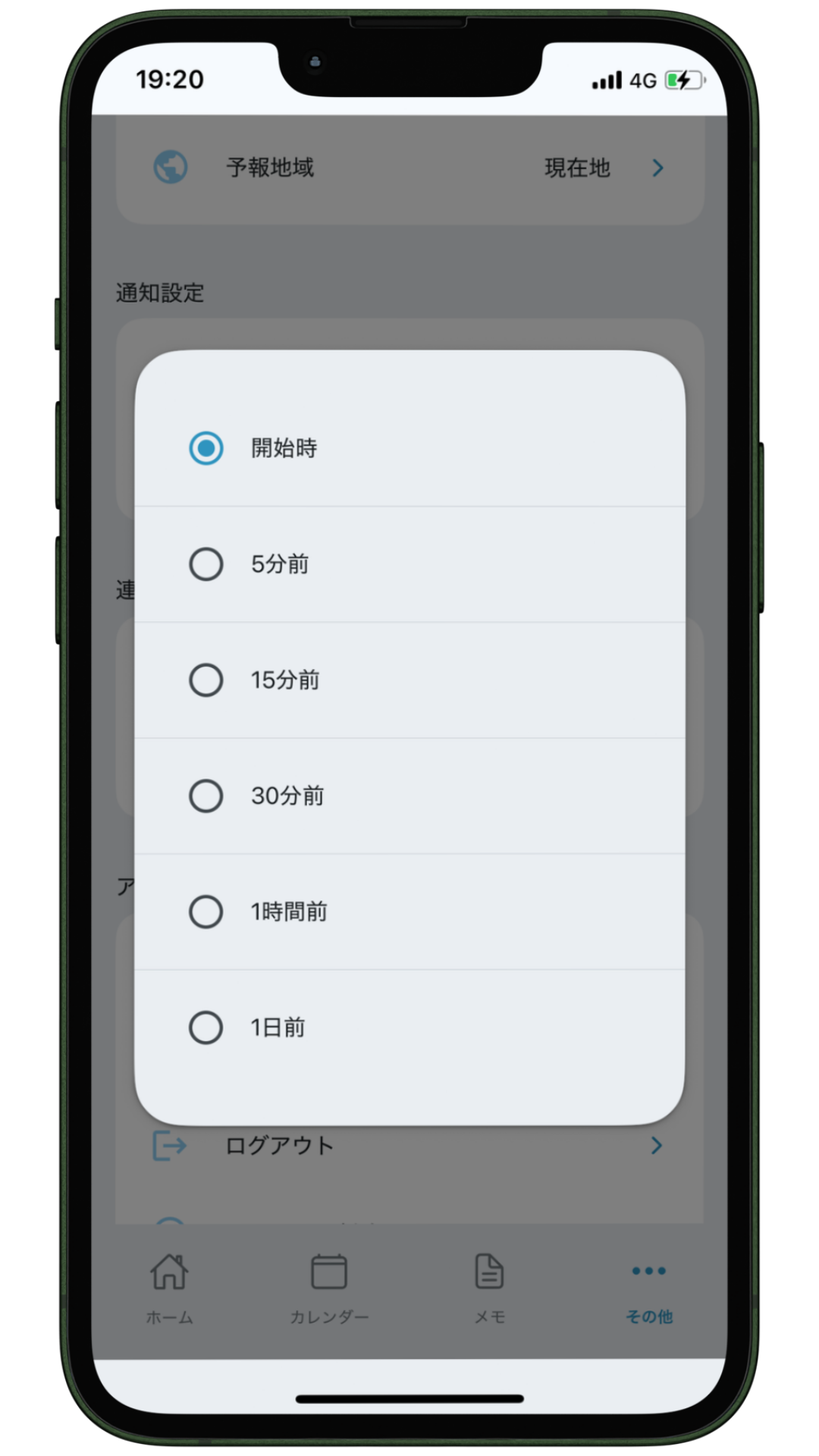 (開始時・5分前・15分前・30分前・1時間前・1日前から選択できます。)