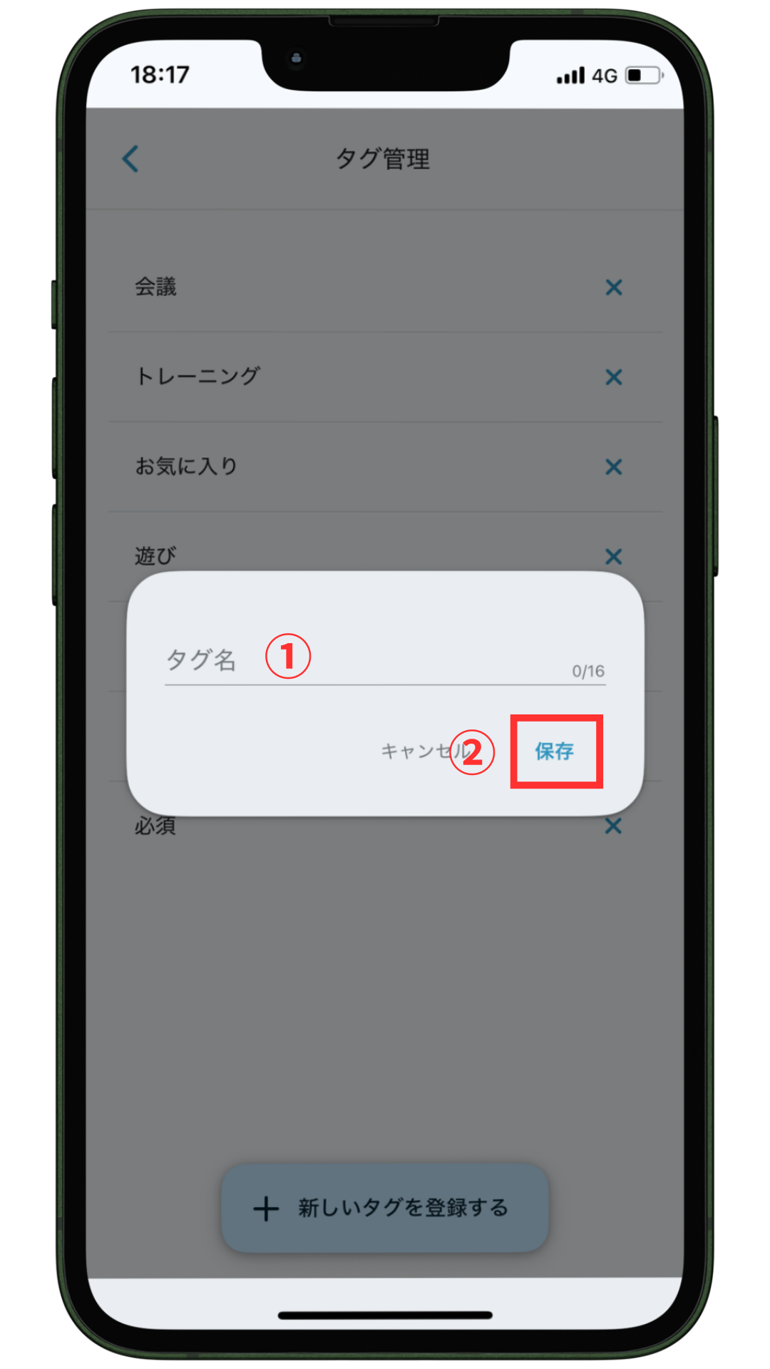 ①タグの名称を入力し、②「保存」ボタンをタップすれば、登録完了です。