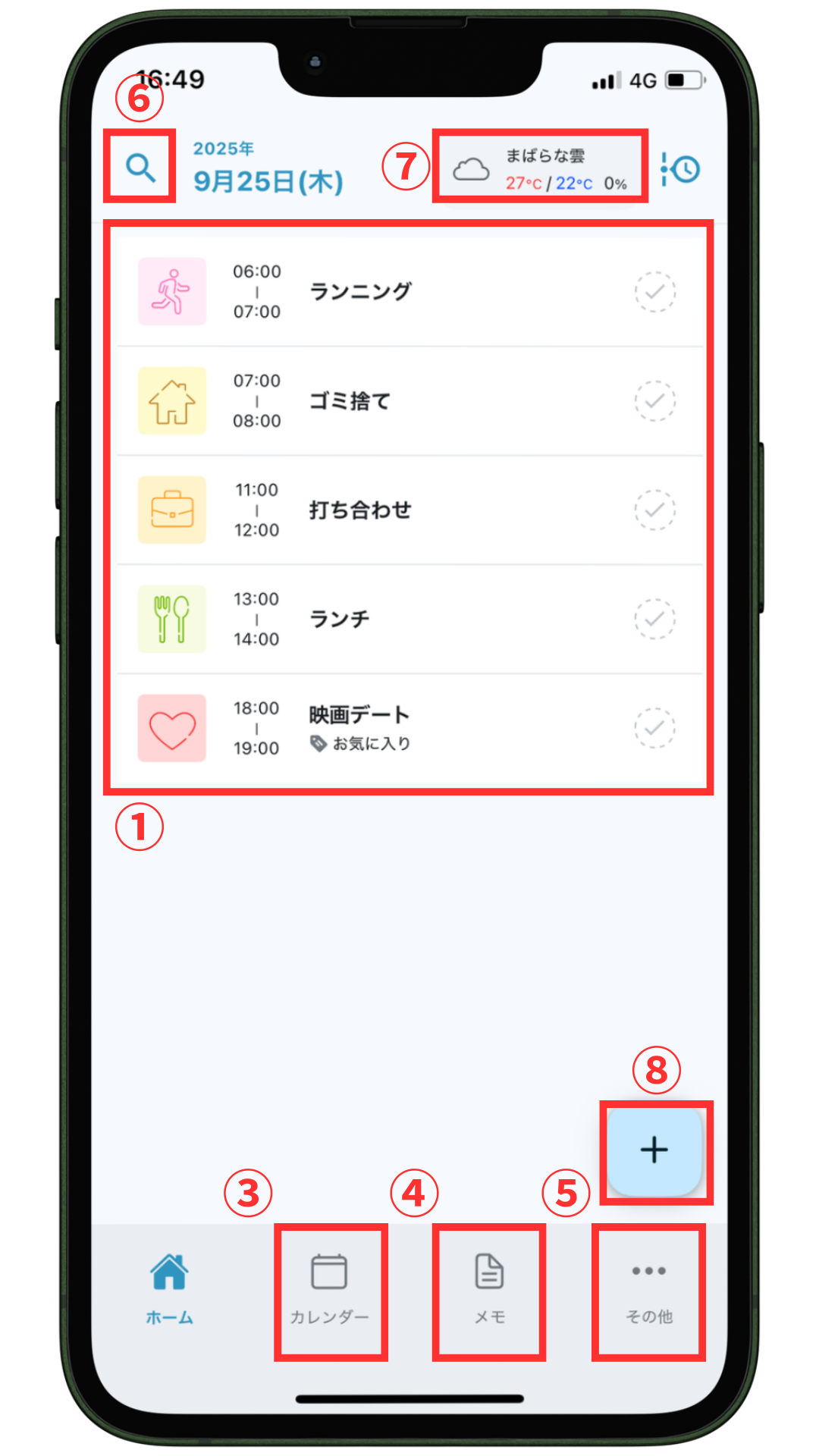 その日のToDoが項目ごとに一覧で表示されます。